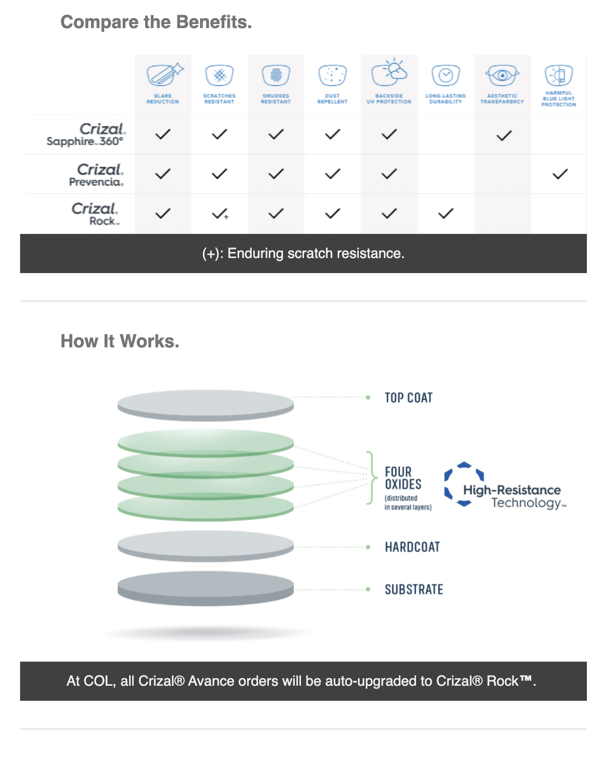 Not only is it here, but it's also being produced on-site, and Avance orders will be treated to an auto-upgrade! As it is, the portfolio remains intact and Crizal® Rock™ will eventually be replacing Avance.